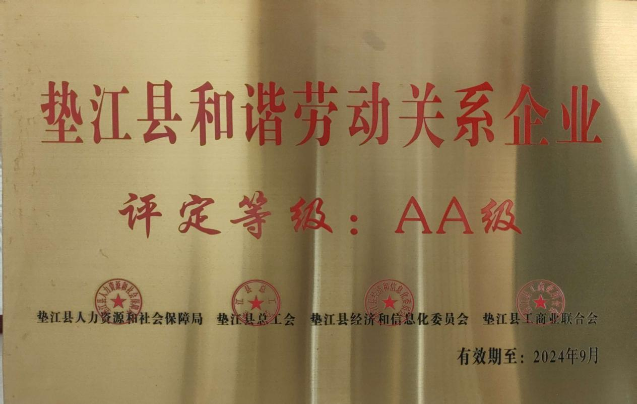 垫江县和谐劳动关系企业 评定等级:AA级